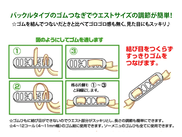 | ココがポイント! | ドイツ製バックルタイプのゴムつなぎでウエストサイズの調節が簡単! |